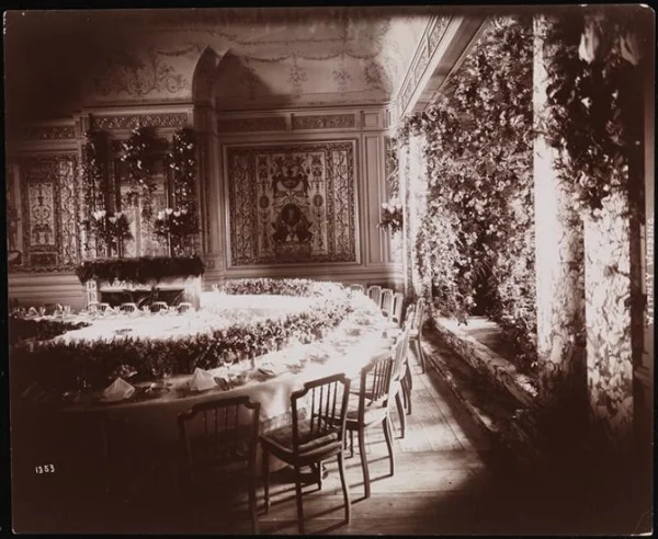 They included nearly every member of the extended Vanderbilt clan (who were barred from Consuelo’s wedding by the fearsome Alva), President and Mrs. Cleveland, and the two principal members of feuding branches of Astor family, Caroline Astor as well as her nephew and social nemesis William Waldorf. Newspapers breathlessly recounted every last detail of the wedding from the clothes, to the music, food, the wedding breakfast and a minute-by-minute description of the service. Fortunately, a photographic record of the floral decorations from the church and the mansion exists in the Museum of the City of New York’s photographic archives.
