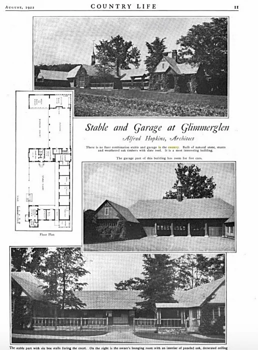 Several decades later, Glimmerglen was sold to financier William Truslow Hyde. Hyde had the mansion enlarged, hired architect Alfred Hopkins to design a number of new buildings for the property, and embellished the grounds. When finished, Glimmerglen was the epitome of a complete gilded age estate. In addition to the mansion set off by beautiful gardens and landscaping,